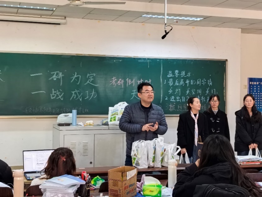 潘玉锋首先代表学院党政向全体考研学子致以亲切问候,他高度赞扬了同学们在备考路上坚定信念、刻苦钻研,鼓励同学们在最后的冲刺月保持信心、把稳节奏,力争取得理想成绩、实现深造梦想。张颜提醒考研同学们在紧张备考之余要注意日常作息、适当锻炼,适时与学院老师交流,拓展支持渠道,增强心理助力。